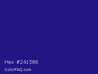 Hex #241586 Color is a dark indigo color and the nearest color is Blue Gem #2c0e8c. Hex code #241586 and RGB value is rgb(36,21,134). In RGB color space, this color is composed of 14% red, 8% green, 53% blue, In CMYK color space, this color is composed of 73% cyan, 84% magenta, 0% yellow , 47% black , In HSL color space, this color has a hue angle of 248° , 73% saturation and 30% lightness.