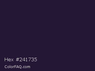 Hex #241735 Color is a very dark violet color and the nearest color is Revolver #2c1632. Hex code #241735 and RGB value is rgb(36,23,53). In RGB color space, this color is composed of 14% red, 9% green, 21% blue, In CMYK color space, this color is composed of 32% cyan, 57% magenta, 0% yellow , 79% black , In HSL color space, this color has a hue angle of 266° , 39% saturation and 15% lightness.