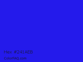 Hex #241aeb Color is a normal indigo color and the nearest color is Bluebonnet #1c1cf0. Hex code #241aeb and RGB value is rgb(36,26,235). In RGB color space, this color is composed of 14% red, 10% green, 92% blue, In CMYK color space, this color is composed of 85% cyan, 89% magenta, 0% yellow , 8% black , In HSL color space, this color has a hue angle of 243° , 84% saturation and 51% lightness.