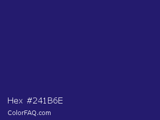 Hex #241b6e Color is a dark indigo color and the nearest color is Midnight Blue #191970. Hex code #241b6e and RGB value is rgb(36,27,110). In RGB color space, this color is composed of 14% red, 11% green, 43% blue, In CMYK color space, this color is composed of 67% cyan, 75% magenta, 0% yellow , 57% black , In HSL color space, this color has a hue angle of 247° , 61% saturation and 27% lightness.