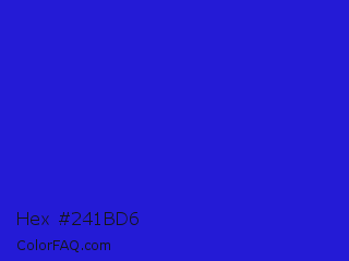 Hex #241bd6 Color is a normal indigo color and the nearest color is Interdimensional Blue #360ccc. Hex code #241bd6 and RGB value is rgb(36,27,214). In RGB color space, this color is composed of 14% red, 11% green, 84% blue, In CMYK color space, this color is composed of 83% cyan, 87% magenta, 0% yellow , 16% black , In HSL color space, this color has a hue angle of 243° , 78% saturation and 47% lightness.