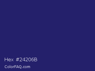 Hex #24206b Color is a dark indigo color and the nearest color is Lucky Point #1a1a68. Hex code #24206b and RGB value is rgb(36,32,107). In RGB color space, this color is composed of 14% red, 13% green, 42% blue, In CMYK color space, this color is composed of 66% cyan, 70% magenta, 0% yellow , 58% black , In HSL color space, this color has a hue angle of 243° , 54% saturation and 27% lightness.
