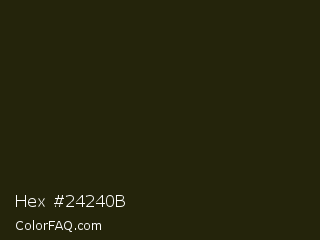 Hex #24240b Color is a almost black yellow color and the nearest color is Mikado #2d2510. Hex code #24240b and RGB value is rgb(36,36,11). In RGB color space, this color is composed of 14% red, 14% green, 4% blue, In CMYK color space, this color is composed of 0% cyan, 0% magenta, 69% yellow , 86% black , In HSL color space, this color has a hue angle of 60° , 53% saturation and 9% lightness.
