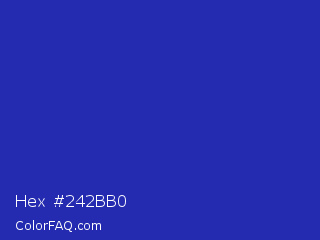 Hex #242bb0 Color is a normal blue color and the nearest color is Persian Blue #1c39bb. Hex code #242bb0 and RGB value is rgb(36,43,176). In RGB color space, this color is composed of 14% red, 17% green, 69% blue, In CMYK color space, this color is composed of 80% cyan, 76% magenta, 0% yellow , 31% black , In HSL color space, this color has a hue angle of 237° , 66% saturation and 42% lightness.