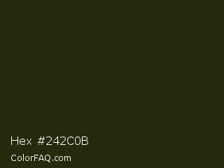 Hex #242c0b Color is a very dark lime color and the nearest color is Black Olive #242e16. Hex code #242c0b and RGB value is rgb(36,44,11). In RGB color space, this color is composed of 14% red, 17% green, 4% blue, In CMYK color space, this color is composed of 18% cyan, 0% magenta, 75% yellow , 83% black , In HSL color space, this color has a hue angle of 75° , 60% saturation and 11% lightness.