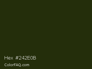 Hex #242e0b Color is a very dark lime color and the nearest color is Seaweed #1b2f11. Hex code #242e0b and RGB value is rgb(36,46,11). In RGB color space, this color is composed of 14% red, 18% green, 4% blue, In CMYK color space, this color is composed of 22% cyan, 0% magenta, 76% yellow , 82% black , In HSL color space, this color has a hue angle of 77° , 61% saturation and 11% lightness.