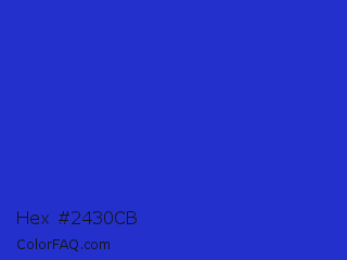Hex #2430cb Color is a normal blue color and the nearest color is Persian Blue #1c39bb. Hex code #2430cb and RGB value is rgb(36,48,203). In RGB color space, this color is composed of 14% red, 19% green, 80% blue, In CMYK color space, this color is composed of 82% cyan, 76% magenta, 0% yellow , 20% black , In HSL color space, this color has a hue angle of 236° , 70% saturation and 47% lightness.