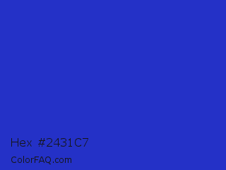 Hex #2431c7 Color is a normal blue color and the nearest color is Persian Blue #1c39bb. Hex code #2431c7 and RGB value is rgb(36,49,199). In RGB color space, this color is composed of 14% red, 19% green, 78% blue, In CMYK color space, this color is composed of 82% cyan, 75% magenta, 0% yellow , 22% black , In HSL color space, this color has a hue angle of 235° , 69% saturation and 46% lightness.
