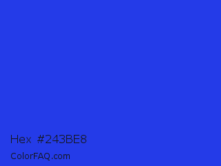Hex #243be8 Color is a normal blue color and the nearest color is Palatinate Blue #273be2. Hex code #243be8 and RGB value is rgb(36,59,232). In RGB color space, this color is composed of 14% red, 23% green, 91% blue, In CMYK color space, this color is composed of 84% cyan, 75% magenta, 0% yellow , 9% black , In HSL color space, this color has a hue angle of 233° , 81% saturation and 53% lightness.