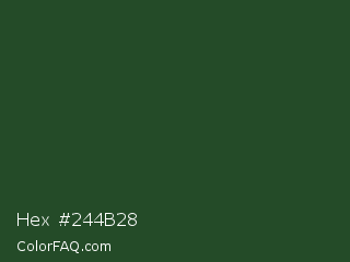 Hex #244b28 Color is a very dark green color and the nearest color is Cal Poly Pomona Green #1e4d2b. Hex code #244b28 and RGB value is rgb(36,75,40). In RGB color space, this color is composed of 14% red, 29% green, 16% blue, In CMYK color space, this color is composed of 52% cyan, 0% magenta, 47% yellow , 71% black , In HSL color space, this color has a hue angle of 126° , 35% saturation and 22% lightness.