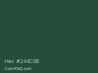 Hex #244d3b Color is a very dark green color and the nearest color is Brunswick Green #1b4d3e. Hex code #244d3b and RGB value is rgb(36,77,59). In RGB color space, this color is composed of 14% red, 30% green, 23% blue, In CMYK color space, this color is composed of 53% cyan, 0% magenta, 23% yellow , 70% black , In HSL color space, this color has a hue angle of 154° , 36% saturation and 22% lightness.