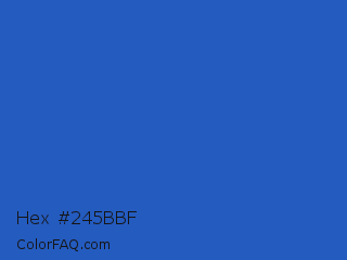 Hex #245bbf Color is a normal blue color and the nearest color is Cerulean Blue #2a52be. Hex code #245bbf and RGB value is rgb(36,91,191). In RGB color space, this color is composed of 14% red, 36% green, 75% blue, In CMYK color space, this color is composed of 81% cyan, 52% magenta, 0% yellow , 25% black , In HSL color space, this color has a hue angle of 219° , 68% saturation and 45% lightness.