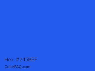 Hex #245bef Color is a normal blue color and the nearest color is Blue Crayola #1f75fe. Hex code #245bef and RGB value is rgb(36,91,239). In RGB color space, this color is composed of 14% red, 36% green, 94% blue, In CMYK color space, this color is composed of 85% cyan, 62% magenta, 0% yellow , 6% black , In HSL color space, this color has a hue angle of 224° , 86% saturation and 54% lightness.