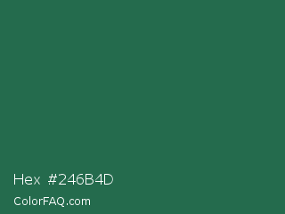 Hex #246b4d Color is a dark green color and the nearest color is Green Pea #1d6142. Hex code #246b4d and RGB value is rgb(36,107,77). In RGB color space, this color is composed of 14% red, 42% green, 30% blue, In CMYK color space, this color is composed of 66% cyan, 0% magenta, 28% yellow , 58% black , In HSL color space, this color has a hue angle of 155° , 50% saturation and 28% lightness.