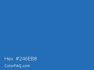 Hex #246eb8 Color is a normal blue color and the nearest color is Denim #1560bd. Hex code #246eb8 and RGB value is rgb(36,110,184). In RGB color space, this color is composed of 14% red, 43% green, 72% blue, In CMYK color space, this color is composed of 80% cyan, 40% magenta, 0% yellow , 28% black , In HSL color space, this color has a hue angle of 210° , 67% saturation and 43% lightness.