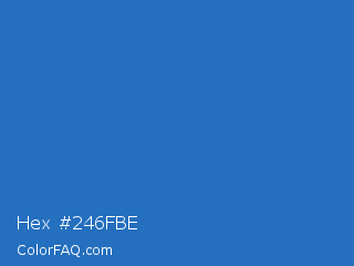 Hex #246fbe Color is a normal blue color and the nearest color is Mariner #286acd. Hex code #246fbe and RGB value is rgb(36,111,190). In RGB color space, this color is composed of 14% red, 44% green, 75% blue, In CMYK color space, this color is composed of 81% cyan, 42% magenta, 0% yellow , 25% black , In HSL color space, this color has a hue angle of 211° , 68% saturation and 44% lightness.