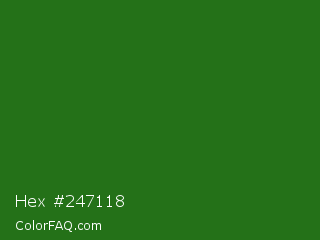 Hex #247118 Color is a dark green color and the nearest color is Bilbao #327c14. Hex code #247118 and RGB value is rgb(36,113,24). In RGB color space, this color is composed of 14% red, 44% green, 9% blue, In CMYK color space, this color is composed of 68% cyan, 0% magenta, 79% yellow , 56% black , In HSL color space, this color has a hue angle of 112° , 65% saturation and 27% lightness.