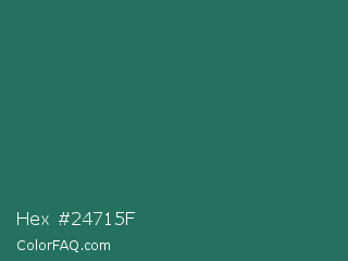 Hex #24715f Color is a dark cyan color and the nearest color is Genoa #15736b. Hex code #24715f and RGB value is rgb(36,113,95). In RGB color space, this color is composed of 14% red, 44% green, 37% blue, In CMYK color space, this color is composed of 68% cyan, 0% magenta, 16% yellow , 56% black , In HSL color space, this color has a hue angle of 166° , 52% saturation and 29% lightness.