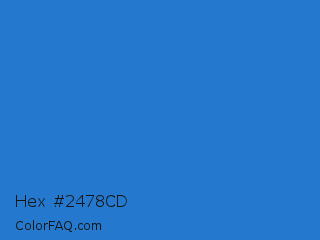 Hex #2478cd Color is a normal blue color and the nearest color is Bright Navy Blue #1974d2. Hex code #2478cd and RGB value is rgb(36,120,205). In RGB color space, this color is composed of 14% red, 47% green, 80% blue, In CMYK color space, this color is composed of 82% cyan, 41% magenta, 0% yellow , 20% black , In HSL color space, this color has a hue angle of 210° , 70% saturation and 47% lightness.
