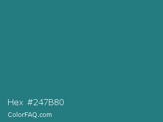 Hex #247b80 Color is a normal cyan color and the nearest color is Elm #1c7c7d. Hex code #247b80 and RGB value is rgb(36,123,128). In RGB color space, this color is composed of 14% red, 48% green, 50% blue, In CMYK color space, this color is composed of 72% cyan, 4% magenta, 0% yellow , 50% black , In HSL color space, this color has a hue angle of 183° , 56% saturation and 32% lightness.