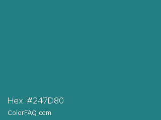 Hex #247d80 Color is a normal cyan color and the nearest color is Elm #1c7c7d. Hex code #247d80 and RGB value is rgb(36,125,128). In RGB color space, this color is composed of 14% red, 49% green, 50% blue, In CMYK color space, this color is composed of 72% cyan, 2% magenta, 0% yellow , 50% black , In HSL color space, this color has a hue angle of 182° , 56% saturation and 32% lightness.