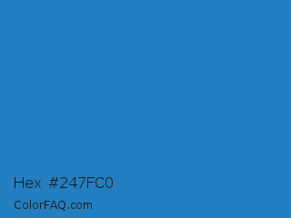 Hex #247fc0 Color is a normal blue color and the nearest color is Cyan Cornflower Blue #188bc2. Hex code #247fc0 and RGB value is rgb(36,127,192). In RGB color space, this color is composed of 14% red, 50% green, 75% blue, In CMYK color space, this color is composed of 81% cyan, 34% magenta, 0% yellow , 25% black , In HSL color space, this color has a hue angle of 205° , 68% saturation and 45% lightness.