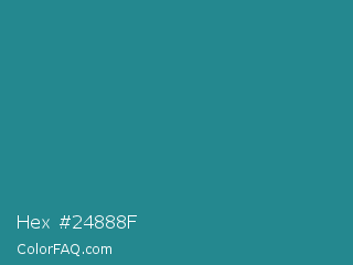 Hex #24888f Color is a normal cyan color and the nearest color is Lochinvar #2c8c84. Hex code #24888f and RGB value is rgb(36,136,143). In RGB color space, this color is composed of 14% red, 53% green, 56% blue, In CMYK color space, this color is composed of 75% cyan, 5% magenta, 0% yellow , 44% black , In HSL color space, this color has a hue angle of 184° , 60% saturation and 35% lightness.
