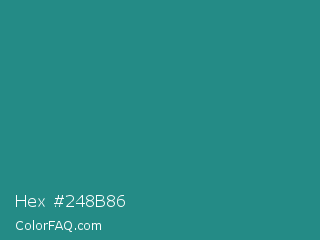 Hex #248b86 Color is a normal cyan color and the nearest color is Lochinvar #2c8c84. Hex code #248b86 and RGB value is rgb(36,139,134). In RGB color space, this color is composed of 14% red, 55% green, 53% blue, In CMYK color space, this color is composed of 74% cyan, 0% magenta, 4% yellow , 45% black , In HSL color space, this color has a hue angle of 177° , 59% saturation and 34% lightness.