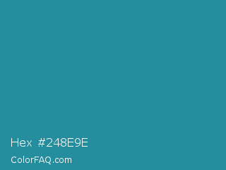 Hex #248e9e Color is a normal cyan color and the nearest color is Jelly Bean #297b9a. Hex code #248e9e and RGB value is rgb(36,142,158). In RGB color space, this color is composed of 14% red, 56% green, 62% blue, In CMYK color space, this color is composed of 77% cyan, 10% magenta, 0% yellow , 38% black , In HSL color space, this color has a hue angle of 188° , 63% saturation and 38% lightness.