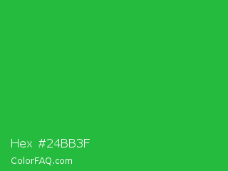 Hex #24bb3f Color is a normal green color and the nearest color is Wageningen Green #34b233. Hex code #24bb3f and RGB value is rgb(36,187,63). In RGB color space, this color is composed of 14% red, 73% green, 25% blue, In CMYK color space, this color is composed of 81% cyan, 0% magenta, 66% yellow , 27% black , In HSL color space, this color has a hue angle of 131° , 68% saturation and 44% lightness.