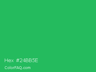 Hex #24bb5e Color is a normal green color and the nearest color is Green Crayola #1cac78. Hex code #24bb5e and RGB value is rgb(36,187,94). In RGB color space, this color is composed of 14% red, 73% green, 37% blue, In CMYK color space, this color is composed of 81% cyan, 0% magenta, 50% yellow , 27% black , In HSL color space, this color has a hue angle of 143° , 68% saturation and 44% lightness.