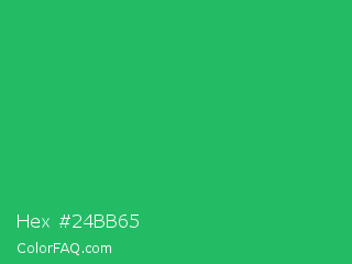 Hex #24bb65 Color is a normal green color and the nearest color is Green Crayola #1cac78. Hex code #24bb65 and RGB value is rgb(36,187,101). In RGB color space, this color is composed of 14% red, 73% green, 40% blue, In CMYK color space, this color is composed of 81% cyan, 0% magenta, 46% yellow , 27% black , In HSL color space, this color has a hue angle of 146° , 68% saturation and 44% lightness.