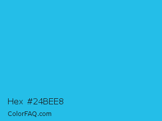 Hex #24bee8 Color is a normal cyan color and the nearest color is Scooter #2ebfd4. Hex code #24bee8 and RGB value is rgb(36,190,232). In RGB color space, this color is composed of 14% red, 75% green, 91% blue, In CMYK color space, this color is composed of 84% cyan, 18% magenta, 0% yellow , 9% black , In HSL color space, this color has a hue angle of 193° , 81% saturation and 53% lightness.