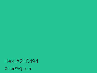 Hex #24c494 Color is a normal green color and the nearest color is Mountain Meadow #30ba8f. Hex code #24c494 and RGB value is rgb(36,196,148). In RGB color space, this color is composed of 14% red, 77% green, 58% blue, In CMYK color space, this color is composed of 82% cyan, 0% magenta, 24% yellow , 23% black , In HSL color space, this color has a hue angle of 162° , 69% saturation and 45% lightness.