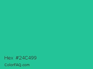 Hex #24c499 Color is a normal cyan color and the nearest color is Shamrock #33cc99. Hex code #24c499 and RGB value is rgb(36,196,153). In RGB color space, this color is composed of 14% red, 77% green, 60% blue, In CMYK color space, this color is composed of 82% cyan, 0% magenta, 22% yellow , 23% black , In HSL color space, this color has a hue angle of 164° , 69% saturation and 45% lightness.