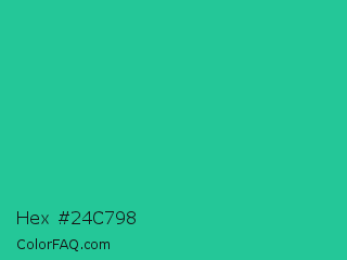 Hex #24c798 Color is a normal green color and the nearest color is Shamrock #33cc99. Hex code #24c798 and RGB value is rgb(36,199,152). In RGB color space, this color is composed of 14% red, 78% green, 60% blue, In CMYK color space, this color is composed of 82% cyan, 0% magenta, 24% yellow , 22% black , In HSL color space, this color has a hue angle of 163° , 69% saturation and 46% lightness.