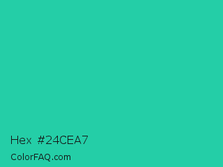 Hex #24cea7 Color is a normal cyan color and the nearest color is Shamrock #33cc99. Hex code #24cea7 and RGB value is rgb(36,206,167). In RGB color space, this color is composed of 14% red, 81% green, 65% blue, In CMYK color space, this color is composed of 83% cyan, 0% magenta, 19% yellow , 19% black , In HSL color space, this color has a hue angle of 166° , 70% saturation and 47% lightness.