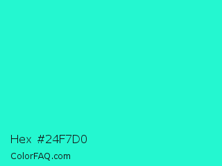 Hex #24f7d0 Color is a normal cyan color and the nearest color is Bright Turquoise #08e8de. Hex code #24f7d0 and RGB value is rgb(36,247,208). In RGB color space, this color is composed of 14% red, 97% green, 82% blue, In CMYK color space, this color is composed of 85% cyan, 0% magenta, 16% yellow , 3% black , In HSL color space, this color has a hue angle of 169° , 93% saturation and 55% lightness.