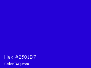 Hex #2501d7 Color is a normal indigo color and the nearest color is Interdimensional Blue #360ccc. Hex code #2501d7 and RGB value is rgb(37,1,215). In RGB color space, this color is composed of 15% red, 0% green, 84% blue, In CMYK color space, this color is composed of 83% cyan, 100% magenta, 0% yellow , 16% black , In HSL color space, this color has a hue angle of 250° , 99% saturation and 42% lightness.