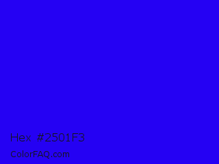 Hex #2501f3 Color is a normal indigo color and the nearest color is Bluebonnet #1c1cf0. Hex code #2501f3 and RGB value is rgb(37,1,243). In RGB color space, this color is composed of 15% red, 0% green, 95% blue, In CMYK color space, this color is composed of 85% cyan, 100% magenta, 0% yellow , 5% black , In HSL color space, this color has a hue angle of 249° , 99% saturation and 48% lightness.