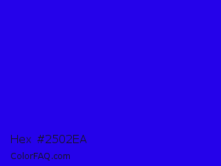Hex #2502ea Color is a normal indigo color and the nearest color is Bluebonnet #1c1cf0. Hex code #2502ea and RGB value is rgb(37,2,234). In RGB color space, this color is composed of 15% red, 1% green, 92% blue, In CMYK color space, this color is composed of 84% cyan, 99% magenta, 0% yellow , 8% black , In HSL color space, this color has a hue angle of 249° , 98% saturation and 46% lightness.