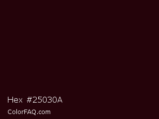 Hex #25030a Color is a almost black red color and the nearest color is Sepia Black #2b0202. Hex code #25030a and RGB value is rgb(37,3,10). In RGB color space, this color is composed of 15% red, 1% green, 4% blue, In CMYK color space, this color is composed of 0% cyan, 92% magenta, 73% yellow , 85% black , In HSL color space, this color has a hue angle of 348° , 85% saturation and 8% lightness.