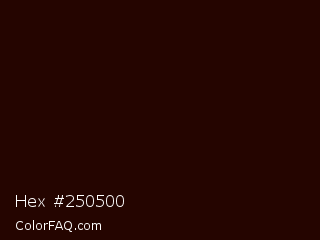 Hex #250500 Color is a almost black red color and the nearest color is Sepia Black #2b0202. Hex code #250500 and RGB value is rgb(37,5,0). In RGB color space, this color is composed of 15% red, 2% green, 0% blue, In CMYK color space, this color is composed of 0% cyan, 86% magenta, 100% yellow , 85% black , In HSL color space, this color has a hue angle of 8° , 100% saturation and 7% lightness.