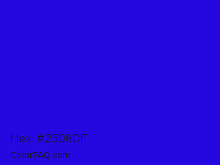 Hex #2508df Color is a normal indigo color and the nearest color is Interdimensional Blue #360ccc. Hex code #2508df and RGB value is rgb(37,8,223). In RGB color space, this color is composed of 15% red, 3% green, 87% blue, In CMYK color space, this color is composed of 83% cyan, 96% magenta, 0% yellow , 13% black , In HSL color space, this color has a hue angle of 248° , 93% saturation and 45% lightness.