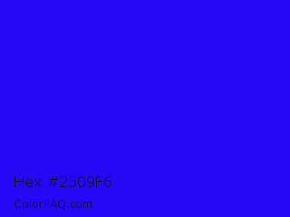 Hex #2509f6 Color is a normal indigo color and the nearest color is Bluebonnet #1c1cf0. Hex code #2509f6 and RGB value is rgb(37,9,246). In RGB color space, this color is composed of 15% red, 4% green, 96% blue, In CMYK color space, this color is composed of 85% cyan, 96% magenta, 0% yellow , 4% black , In HSL color space, this color has a hue angle of 247° , 93% saturation and 50% lightness.