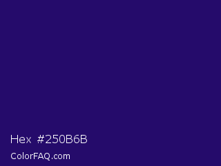 Hex #250b6b Color is a dark indigo color and the nearest color is Paris M #26056a. Hex code #250b6b and RGB value is rgb(37,11,107). In RGB color space, this color is composed of 15% red, 4% green, 42% blue, In CMYK color space, this color is composed of 65% cyan, 90% magenta, 0% yellow , 58% black , In HSL color space, this color has a hue angle of 256° , 81% saturation and 23% lightness.
