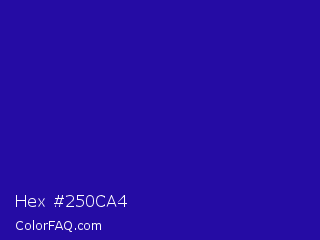Hex #250ca4 Color is a normal indigo color and the nearest color is Blue Gem #2c0e8c. Hex code #250ca4 and RGB value is rgb(37,12,164). In RGB color space, this color is composed of 15% red, 5% green, 64% blue, In CMYK color space, this color is composed of 77% cyan, 93% magenta, 0% yellow , 36% black , In HSL color space, this color has a hue angle of 250° , 86% saturation and 35% lightness.
