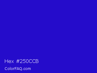 Hex #250ccb Color is a normal indigo color and the nearest color is Interdimensional Blue #360ccc. Hex code #250ccb and RGB value is rgb(37,12,203). In RGB color space, this color is composed of 15% red, 5% green, 80% blue, In CMYK color space, this color is composed of 82% cyan, 94% magenta, 0% yellow , 20% black , In HSL color space, this color has a hue angle of 248° , 89% saturation and 42% lightness.