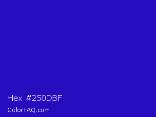 Hex #250dbf Color is a normal indigo color and the nearest color is Interdimensional Blue #360ccc. Hex code #250dbf and RGB value is rgb(37,13,191). In RGB color space, this color is composed of 15% red, 5% green, 75% blue, In CMYK color space, this color is composed of 81% cyan, 93% magenta, 0% yellow , 25% black , In HSL color space, this color has a hue angle of 248° , 87% saturation and 40% lightness.