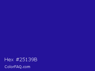 Hex #25139b Color is a normal indigo color and the nearest color is Blue Gem #2c0e8c. Hex code #25139b and RGB value is rgb(37,19,155). In RGB color space, this color is composed of 15% red, 7% green, 61% blue, In CMYK color space, this color is composed of 76% cyan, 88% magenta, 0% yellow , 39% black , In HSL color space, this color has a hue angle of 248° , 78% saturation and 34% lightness.